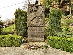 Denkmal vor der Kirche St. Simon und Juda Steinblock, oben Relief des hl. Georg zu Pferde, der