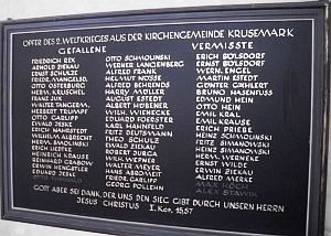 Tafel 2. Weltkrieg: Opfer des 2.Weltkrieges aus der Kirchgemeinde Krusemark: (Namen) Gott aber sei Dank, der uns den Sieg gibt durch unseren Herrn Jesus Christus, I. Kor.15,57