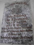 Tafel H. F. Krusemark: Hans Friedrich von Krusemark (Daten) Königl. Preuss. General Lieutenant, Ritter des schwarzen Adler Ordens, Erbherr auf Hohenberg-Krusemark und Gr. Ellingen