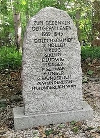 Eine kleine Gedenkstätte mit steinernen Sitzbänken und zwei Gedenksteinen an der Straße zur B 92. Ein grob behauener und an der Vorderseite geglätteter Stein enthält die Namen der zwölf Gefallenen des Ersten Weltkrieges. Er wurde am 22. Oktober 1922 eingeweiht. Der Stein für die Opfer des Zweiten Weltkrieges ist ein Granitfindling aus der Umgebung und hat auf der Vorderseite elf Namen.