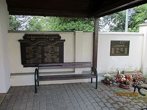 1. Weltkrieg: Den Opfern des Weltkrieges gewidmet 1914 – 1918 2. Cor. 1,3-5 (unter den jeweiligen Ortsnamen die Gefallenennamen, Auswärtige = Text auf der Tafel: auswärtige Glieder hiesiger Familien))