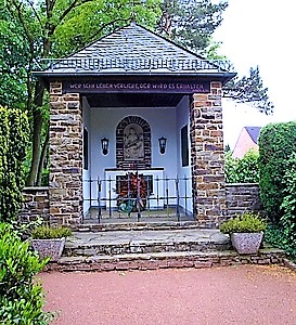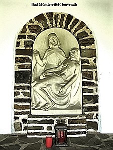 Bogennische das Relief einer Pietá. An den Seitenwänden je zwei Bronzetafeln mit den Namen