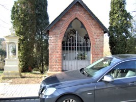 Andachtsstation, kleiner Bau aus Ziegelsteinen, vorne offener Türbogen, durch Gitter verschlossen, enthält Marienfigur mit Kind, rechts und links der Figur an den Wänden zehn Eichenholzkreuze in Form eines Eisernen Kreuzes (Größe ca. 40x40 cm), jeweils silberfarben beschriftet, je ein Exemplar für jeden Gefallenen. Beschriftung teilweise unleserlich.