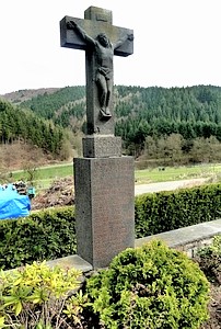Jammelshofen (08.03.1945), Gemeinde Kaltenborn, Landkreis Ahrweiler, Rheinland-PfalzPLZ 53520 Auf dem Friedhof in Jammelshofen steht ein Denkmal für die am 08.03.1945 gefallenen Soldaten. Auf einem schmalen hohen Basaltlavasockel ist ein Kreuz mit dem Gekreuzigten errichtet. Auf dem Sockel stehen die Namen Gefallenen. Bisher konnten fünfzehn Namen gefunden werden, einige könnten sich noch unter dem Bewuchs verbergen.