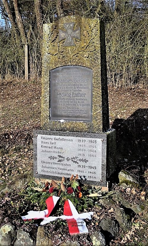Gedenkstein mit deutschem Kreuz und Eichenlaub. Darunter zwei Gedenkplatten