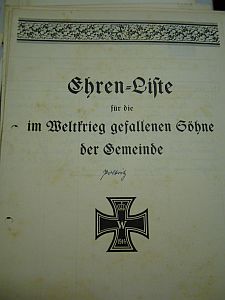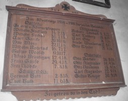 Gedenktafeln und Epitaph in der Kirche. Ehrenlisten für die Gefallenen des 1. Weltkriegs. Soldatengräber, Gedenken auf Familiengräbern. Namen der Gefallenen des 2. Weltkriegs aus Archiven.