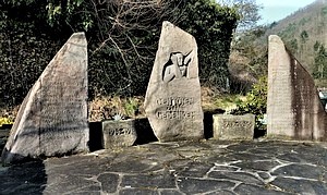 Kirchsahr (Kirche: Treppenaufgang), Landkreis Ahrweiler, Rheinland-PfalzPLZ 53505 Das Denkmal befindet sich neben dem Treppenaufgang zur Pfarrkirche St. Martin in Kirchsahr. Es besteht aus drei Felsbrocken, die Vorderseiten geglättet, auf den beiden äußeren Steinen stehen die Namen der Gefallenen beider Weltkriege. Auf dem mittleren Stein ist der Oberkörpers eines Mannes dargestellt, dem sich von rechts eine Hand nähert. Eine kleine Signatur rechts: NACH KÄTHE KOLLWITZ. Im unteren Teil befindet sich eine Widmung. Zwischen dem rechten und linken Stein stehen kleinere Brocken mit den Jahreszahlen 1914-1918 und 1939-1945. Keine Trennung der Gefallenen beider Kriege.