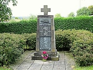 Aus Steinquadern zusammengesetztes nach oben konisch zulaufendes Denkmal mit einem Kreuz. Darunter Gedenkplatten
