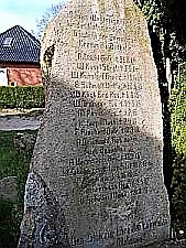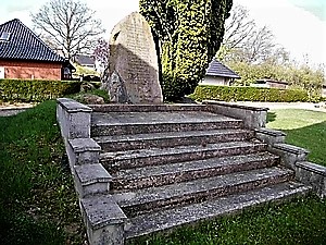 Denkmal für die Gefallenen des 1. Weltkriegs, aufgerichteter Findling auf einem kleinen Hügel mit Treppe. Gedenken auf Familiengräbern.