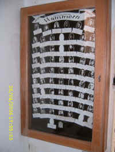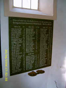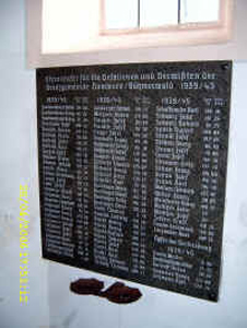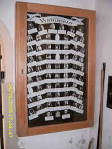 Neben den beiden Steintafeln befinden sich auch noch zwei Holzrahmen mit Passbildern der Gefallenen in der Gedenkhalle.
