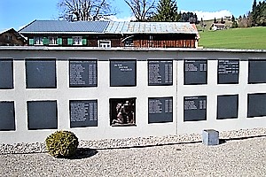 2011 neu errichtetes Denkmal, dass in die Urnenmauer des Friedhofes integriert wurde. Die Daten weichen teilweise leicht von dem alten Denkmal an der äußeren Friedhofsmauer ab und wurden um die Opfer der NS-Euthanasie ergänzt. Die Zivilopfer gehörten der lokalen Widerstandsbewegung an.