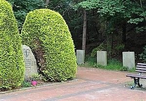 Drei Grabsteine auf einem separaten Bereich des Dünenfriedhofs (rechts im Bild). Der mittlere steht für Opfer, deren Identitäten nicht bekannt sind. Inschrift siehe unten. In diesem Areal des Friedhofs wurden vor allem zahlreiche Deutschstämmige aus dem Baltikum beigesetzt. Ihnen zu Ehren steht eine Widmung auf dem großen Findling.
