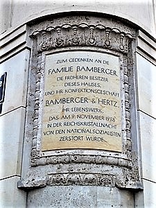 ZUM GEDENKEN AN DIE FAMILIE BAMBERGER, DIE FRUEHEREN BESITZER DIESES HAUSES, UND IHR KONFEKTIONSGESCHÄFT BAMBERGER & HERTZ, IHR LEBENSWERK, DAS AM 9. NOVEMBER 1938 IN DER REICHSKRISTALLNACHT VON DEN NATIONALSOZIALISTEN ZERSTÖRT WURDE.