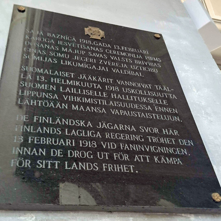 Unter der Gedenktafel der Finnen wurde eine Leinwand aufgestellt mit Notizen zur Geschichte