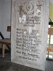 Aus der Gemeinde Liepe starben im Weltkriege 1914 – 1918 den Heldentod im Kampfe für die Heimat. (Namen) Ehre ihrem Andenken.