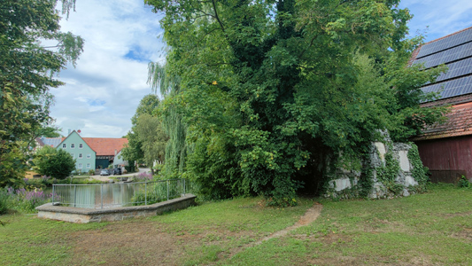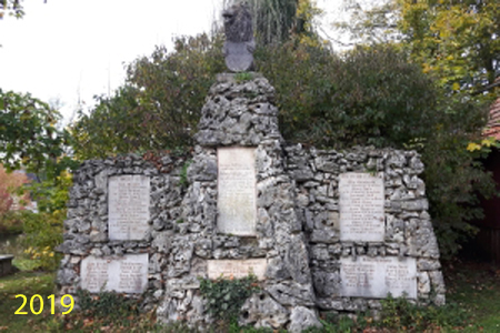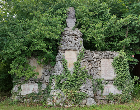 2025 war das Denkmal von Efeu und Flechten bewachsen und die Tafel des 1. Weltkriegs kaum mehr lesbar.