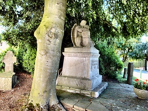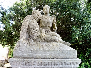 Verzierungen. Oben auf dem Block steht eine Skulptur mit einem sterbenden Soldaten den ein Engel mit