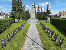 Denkmal für die Gefallenen des 1. und 2. Weltkriegs, aufgerichtete Granitplatte auf abgestuftem Sockel, davor Namenstafeln für die Gefallenen des 2. Weltkriegs, dahinter früher im Halbkreis einzelne Namensplatten für die Gefallenen des 1. Weltkriegs (nach 2013 beiderseits des Weges zum Denkmal aufgestellt).