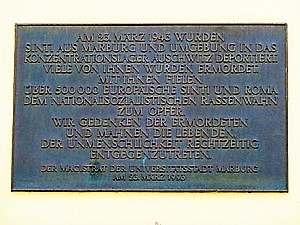 AM 23. MÄRZ 1943 WURDEN SINTI AUS MARBURG UND UMGEBUNG IN DAS KONZENTRATIONSLAGER AUSCHWITZ DEPORTIERT. VIELE VON IHNEN WURDEN ERMORDET. MIT IHNEN FIELEN ÜBER 500 000 EUROPÄISCHE SINTI UND ROMA DEM NATIONALSOZIALISTISCHEN RASSENWAHN ZUM OPFER. WIR GEDENKEN DER ERMORDETEN UND MAHNEN DIE LEBENDEN, DER UNMENSCHLICHKEIT RECHTZEITIG ENTGEGENZUTRETEN.