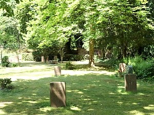 Gräberfeld für Zwangsarbeiter/innen verschiedener Nationen, die während des Zweiten Weltkriegs in Marburg gestattet wurden. Die wenigen Grabsteine stehen wohl nur für einen Bruchteil der hier beerdigten Toten.