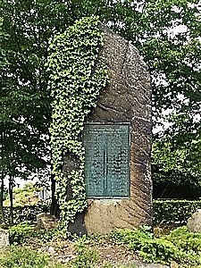 Ca. 4m hoher, senkrecht aufgestellter Naturstein mit eingelassener Bronzetafel und Lorbeerzweig an