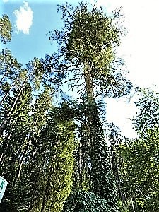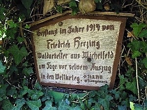 Michelfeld (Herzing-Tanne), Stadt Auerbach i.d.OPf., Landkreis Amberg-Sulzbach, Oberpfalz, BayernPLZ 91275 Holztafel mit Inschrift an einem Baum. Die Tanne befindet sich an einer Weggabelung an der sogenannten Forellenstraße im Veldensteiner Forst.