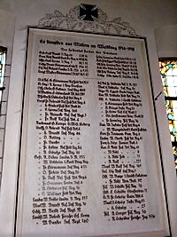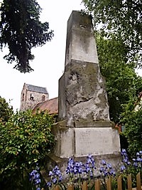 Denkmal für die Gefallenen des 1. Weltkriegs, abgestufte Stele mit Resten eines Reliefs. Gedenktafeln in der Kirche. Ehrenliste für die Gefallenen des 1. Weltkriegs. Soldatengrab