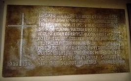 Tafel 2. Weltkrieg: Herr du hast uns heimgesucht 1933/1939/1945. Gefallene, durch Bomben getötete, als lebensunwert ausgelöschte, im Widerstand geopferte, gemordete Juden, Blutzeugen des Glaubens, Vermisste, Verschleppte, Verzweifelte, aller Blut schreit zu dir – Herr erbarme dich unserer Not und Schuld, mach uns zu Boten deines Friedens.