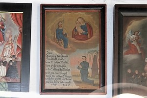 Mittersill (Schmerzenskapelle), Bezirk Zell am See, Salzburg, ÖsterreichPLZ 5730 In der Schmerzenskapelle an der Pfarrkirche (durch eine separate Tür vom Friedhof aus zu betreten): Votivtafel an der Wand.