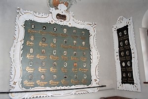Seelenkapelle an der Pfarrkirche (durch eine separate Tür vom Friedhof aus zu betreten): Gedenktafeln mit Namen und Fotos an der Wand.