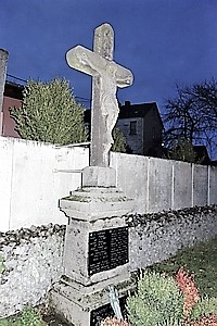 An der Friedhofsmauer steht ein steinernes Kruzifix. Am Sockel erinnert eine Namenstafel an die