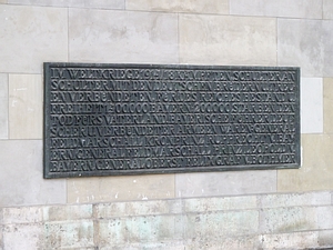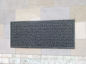 Westliche Tafel: IM WELTKRIEGE 1914/18 KÄMPFTEN, SCHULTER AN SCHULTER MIT DEN DEUTSCHEN BRÜDERN U. TREUEN VERBÜNDETEN, FÜR DES REICHES BESTAND U. FREIHEIT 1.400.000 BAYERN; 200.000 STARBEN DEN TOD FÜRS VATERLAND. BAYERISCHE FÜHRER DEUTSCHER U. VERBÜNDETER ARMEEN WAREN: GENERALFELDMARSCHALL KRONPRINZ RUPPRECHT V. BAYERN, GENERALFELDMARSCHALL PRINZ LEOPOLD V. BAYERN, GENERALOBERST FELIX GRAF V. BOTHMER