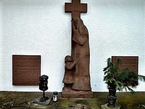 Das Denkmal an der Friedhofshalle in Müsch besteht aus einem Steinkreuz; davor eine trauernde Mutter