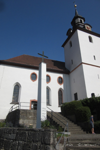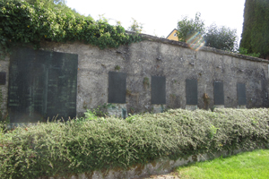 Eine moderne hohe Säule mit krönendem Kreuz mahnt an beide Weltkriege. In die Mauer rechterhand sind Tafeln mit den Namen der Gefallenen und Vermissten eingelassen.