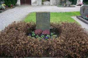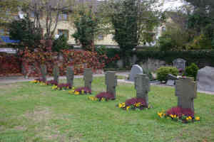 Im Friedhof: sieben Steinkreuze mit je einem Namen, am anderen Ende des Friedhofes ein Grab mit Steinplatte darauf drei Namen.