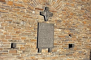 Schrifttafel Außenwand der Kirche: Zu Ehren des Leidens und Sterbens unseres Herrn Jesu Christi. Der Verheerlichung des heiligen Märtyrers Donatus. Dem Gedächtnis unserer Gefallenen. Gelobt zu Neuhäusel am 11. Februar 1945.