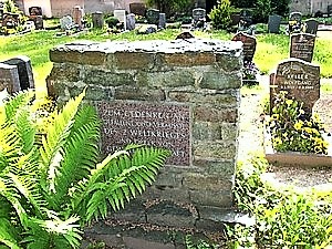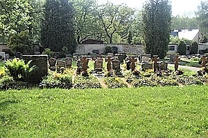 Gedenkstein (ohne Namen), daneben sechs Kriegsgräber auf dem Friedhof. Ein Grab ist ohne Namen und nur mit dem Hinweis auf Jesaja 43-1 versehen