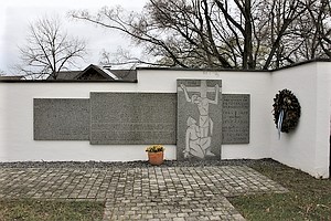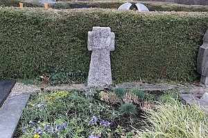Vor dem Friedhof; Tafeln außen an der Friedhofsmauer; vom Friedhof Soldatengrab und Daten von privaten Gedenksteinen.