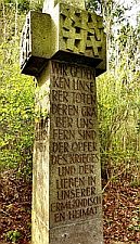 rechts ein Kreuz und links eine Kugelform, darunter stehen auf der Stele die Jahreszahlen 1939 / 1945.