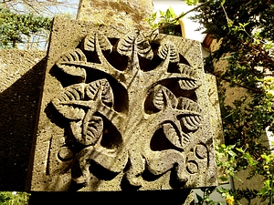 rechten Seite ein Lebensbaum und die auf zwei Seiten des Baumes verteilte Jahreszahl 1969, wohl das