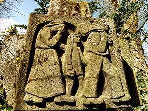 Seitenflächen mehrere Widmungen, im oberen Teil im Kreuzbereich auf den Kopfenden Reliefs: auf der