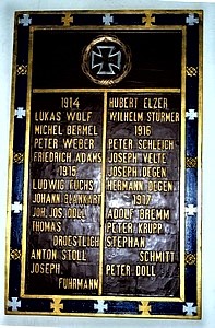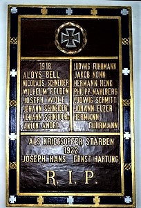 Niederzissen (Kirche), Landkreis Ahrweiler, Rheinland-PfalzPLZ 56651 In der Pfarrkirche befinden sich zwei Namenstafeln (Metallplatten). Der innere Bereich der Platten ist schwarz gefärbt, ein schmaler umlaufender Rahmen ist blau, er ist verziert mit hellen Eisernen Kreuzen, sich abwechselnd mit einer goldfarbenen Blume. Unten und oben sind nur Eiserne Kreuze, abwechselnd hell und goldfarben. Das Innere der ersten Platte ist oben quergeteilt, zwei Felder sind senkrecht geteilt. In diesen Feldern stehen die Namen der Gefallenen des Ersten Weltkrieges. Oben in dem Querfeld ist ein Eisernes Kreuz umgeben von einem goldfarbenen Kranz aus Lorbeerblättern. Die zweite Platte hat die gleiche Aufteilung, lediglich unten ein zweites Querfeld. Hier werden zwei Kriegsopfer genannt, die 1922 verstorben sind, darunter das R.I.P.