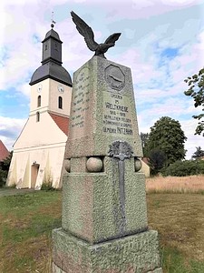 Denkmal für die Gefallenen des Ersten Weltkriegs vor der Kirche: Stele mit krönendem Adler und angebrachtem Metall-Eisernen Kreuz, Stahlhelm-Plakette und Metall-Schwert. Wandtafel für die Gefallenen des Zweiten Weltkriegs in der Kirche. Kriegsopfer-Gräber.