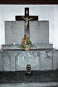 Gedenktafel mit Kruzifix über altarähnlichen, mit Eisernen Kreuz gezierten Unterbau.