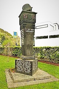 verkantete Stele errichtet. Auf den Seiten stehen mehrere Widmungen, darüber Eiserne Kreuze (
