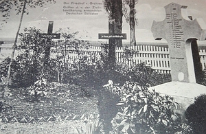 Ehrenfriedhof Grabkreuze: Hier ruhen in Gott tapfere deutsche Krieger. Hergerichtet von 2. Komp. Landst. Inf. Btl. Gießen I. 1.4.1915.