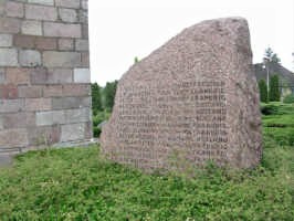 Vor der Kirche von Osterlinnet in einer kurzgeschnittenen Buschgruppe steht ein Gedenkstein mit Inschrift, auf den beiden Seiten des unsymmetrischen Findlings die zweiundzwanzig Namen der Kriegstoten des Ersten Weltkrieges.