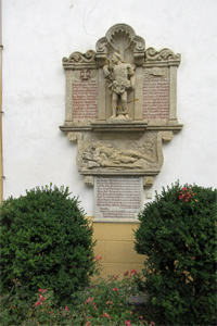 Steinrelief an der Außenwand der Kirche. In der Mitte der Tafeln für den 1. Weltkrieg ist der heilige Sebastian dargestellt, darunter ein gefallener Soldat.