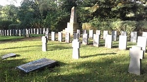 Kriegsgräberstätte und Gedenken auf Familiengräbern auf dem Friedhof. Auf der Kriegsgräberstätte sind im hinteren Bereich die sowjetischen Gräber mit stehenden Namenssteinen angelegt. Auf der freien Fläche davor liegen die deutschen Kriegsopfer. Die Namen sind auf einer Metallplatte aufgelistet. Die Namen auf den sowjetischen Gräbern sind in kyrillischen Buchstaben geschrieben und können nicht genau wiedergegeben werden.