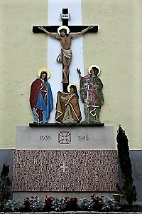 Denkmal aussen an der Kirche, Namen auf einem Sockel und darüber Kruzifix mit Heiligenfiguren; zusätzlich Daten von privaten Gedenksteinen